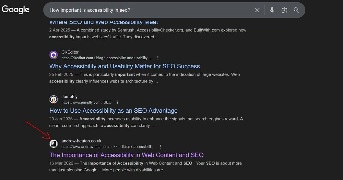 Now, let's say someone wants to understand how accessibility relates to search engine optimisation. They may search for something like "how important is accessibility in SEO?" If I run that exact search term, I find a number of articles and blog posts similar to what I wrote.