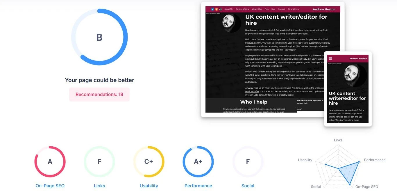 But those are the hard facts. These tools give me data, which is just a small part of optimising a website. I'm a writer, so what of the actually written content? How does that stack up?