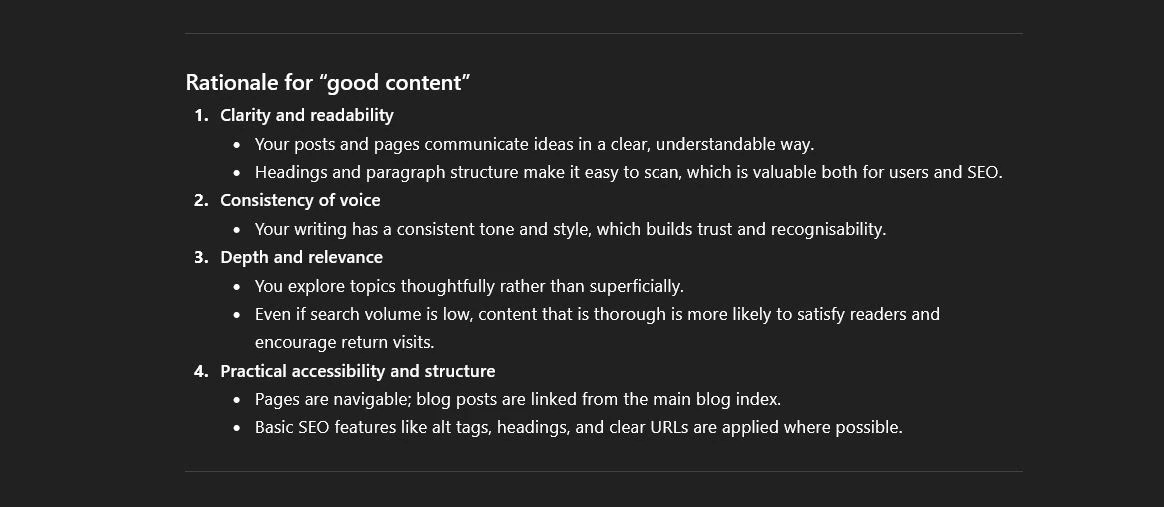 I can say with a fair amount of confidence that I believe in my own skills as a writer. I know I can do this. However, using ChatGPT to give a summary of what constitutes "good content" on my site gives me a snapshot of what appears to be doing well.
