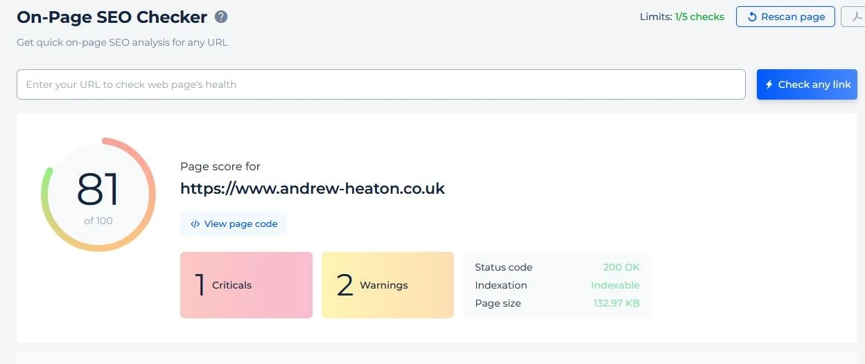 Take SEOptimer and Sitechecker as examples. I said before that I'm using the free versions, which come with daily limits. On top of that, they only analyse the first page of a website. To get more out of it, I'd need to pay for a subscription.
